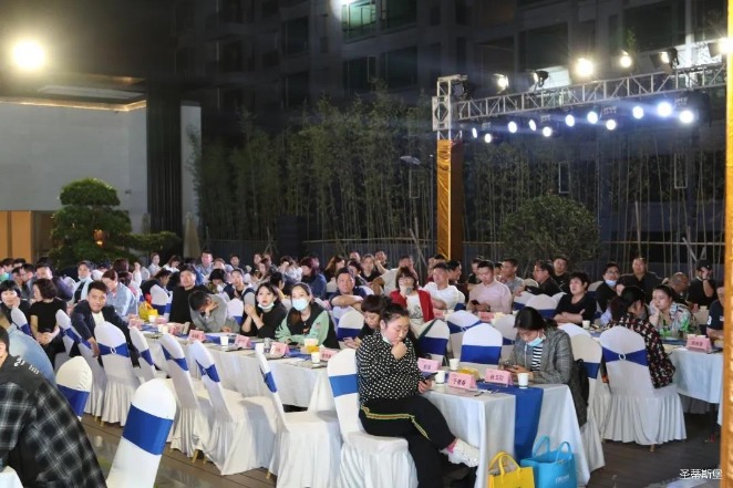 经销商晚宴当日晚6时许,以【乘“圣”跨越】为主题的,BB贝博艾弗森集团第45届国际家具展接待晚宴暨2020年度优秀经销商颁奖盛典,在营销中心四楼景观花园隆重举行,来自全国各地的经销商朋友欢聚一堂,共同分享一场精彩纷呈的晚宴。