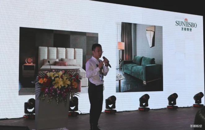 华灯璀璨的开场仪式,点燃了现场如火如荼的气氛。BB贝博艾弗森集团营销总经理陈玉伟先生对晚会进行了主题发言,他对2020年的营销工作进行了总结,并着重从营销工作部署、重点项目开展、产品整合、拎包帮扶、渠道运营和移动+定制整装优势等方面对2021年的营销工作做了全面的统筹规划。同时,他还讲解了“美国梦凯莎床垫”新品的产品工艺、市场优势、产品定位,使经销商对我们的新产品拥有更深入的认识和了解。